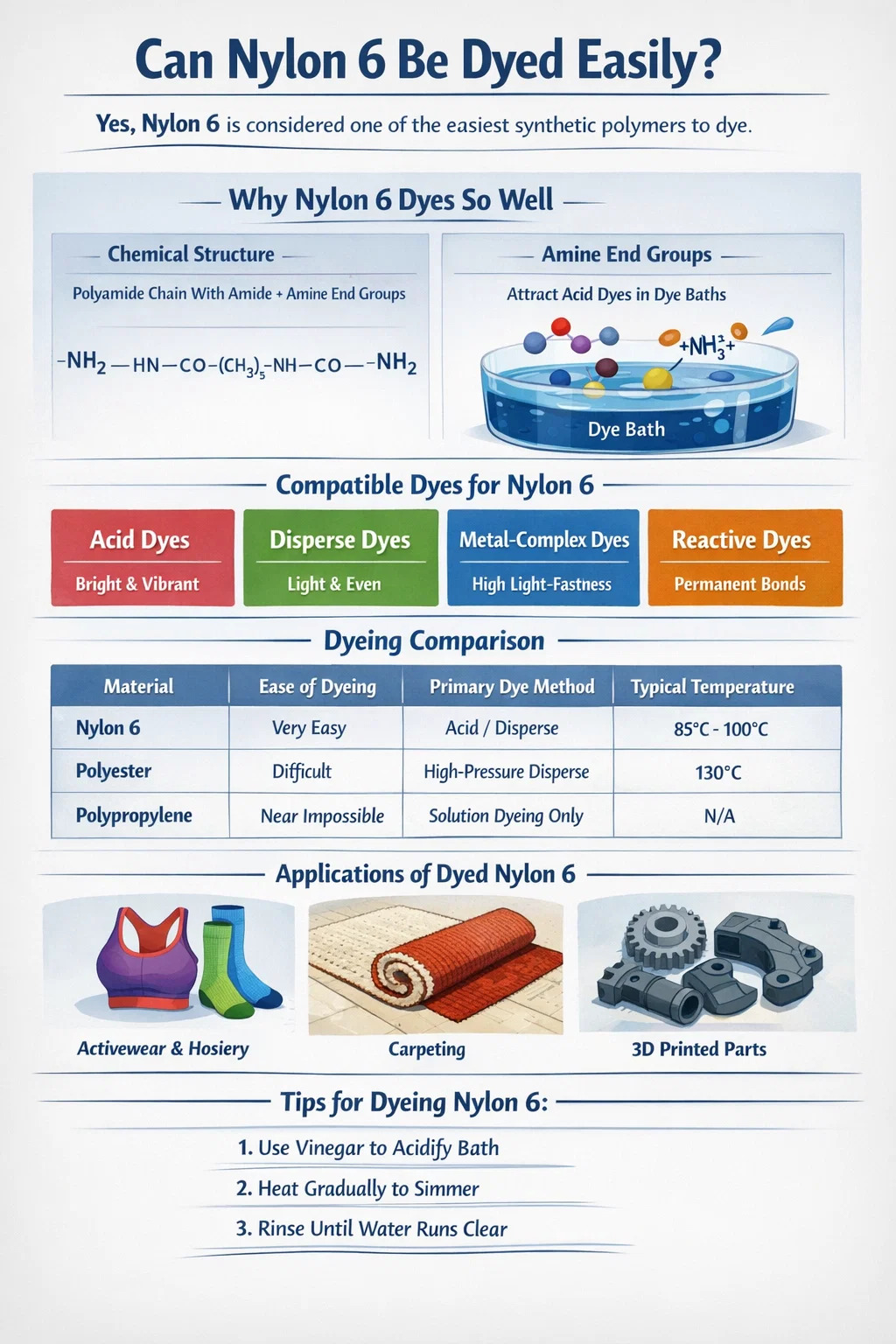 Ya, Nilon 6 dianggap sebagai salah satu polimer sintetik yang paling mudah untuk diwarnai , terutama jika dibandingkan dengan plastik lain seperti poliester atau polipropilena. Struktur kimianya yang unik mengandung banyak situs reaktif yang memungkinkan molekul pewarna membentuk ikatan permanen yang kuat. Afinitas yang tinggi terhadap pewarna berarti bahwa Nylon 6 dapat mencapainya cerah, warna yang dalam dan tahan luntur warna yang sangat baik menggunakan proses pewarnaan air standar pada suhu yang relatif rendah.