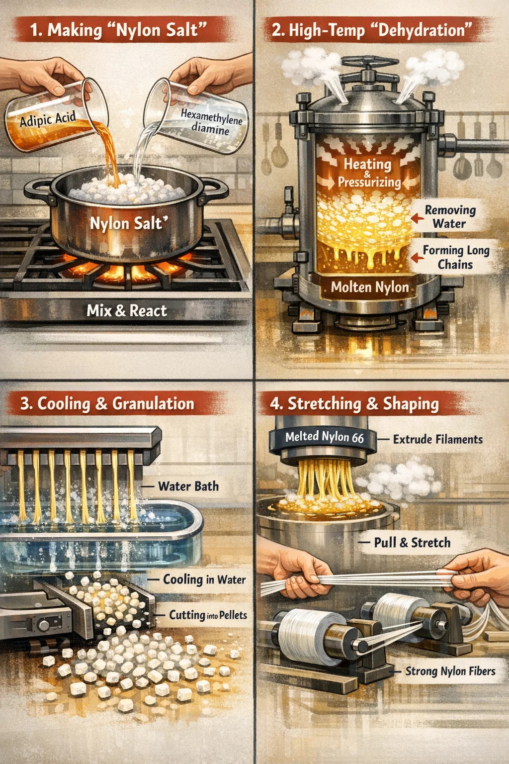 Nilon 66 , juga dikenal sebagai poliamida 66, adalah salah satu plastik rekayasa yang paling banyak digunakan di dunia. Proses produksinya seperti "membuat sup" dan "menarik mie" di dapur, mengutamakan proporsi yang tepat dan pemanasan yang terkontrol.