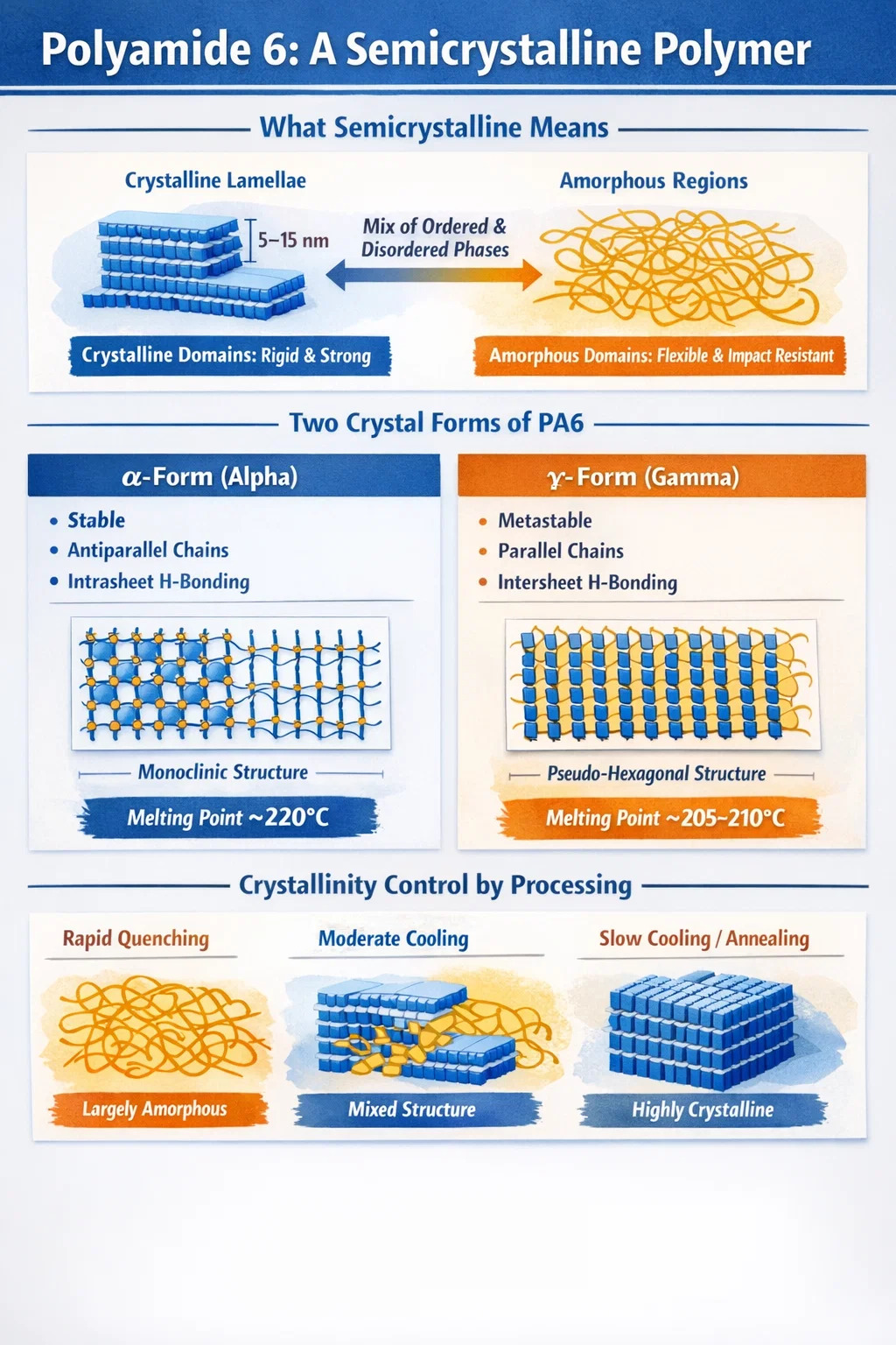Kesalahpahaman yang umum adalah bahwa PA6 bersifat "kristal" atau "amorf" bergantung pada cara pemrosesannya. Pada kenyataannya, proporsi masing-masing fasa berubah seiring dengan kondisi pemrosesan, riwayat termal, dan kadar air — namun kedua fasa tersebut selalu ada sampai tingkat tertentu dalam Poliamida 6 padat. PA6 yang didinginkan dengan pendinginan dapat memiliki indeks kristalinitas serendah beberapa persen, sedangkan bahan yang didinginkan atau dianil secara perlahan dapat mencapai sekitar 35%. Tidak ada satu pun ekstrem yang menghasilkan material yang murni satu fase atau fase lainnya.