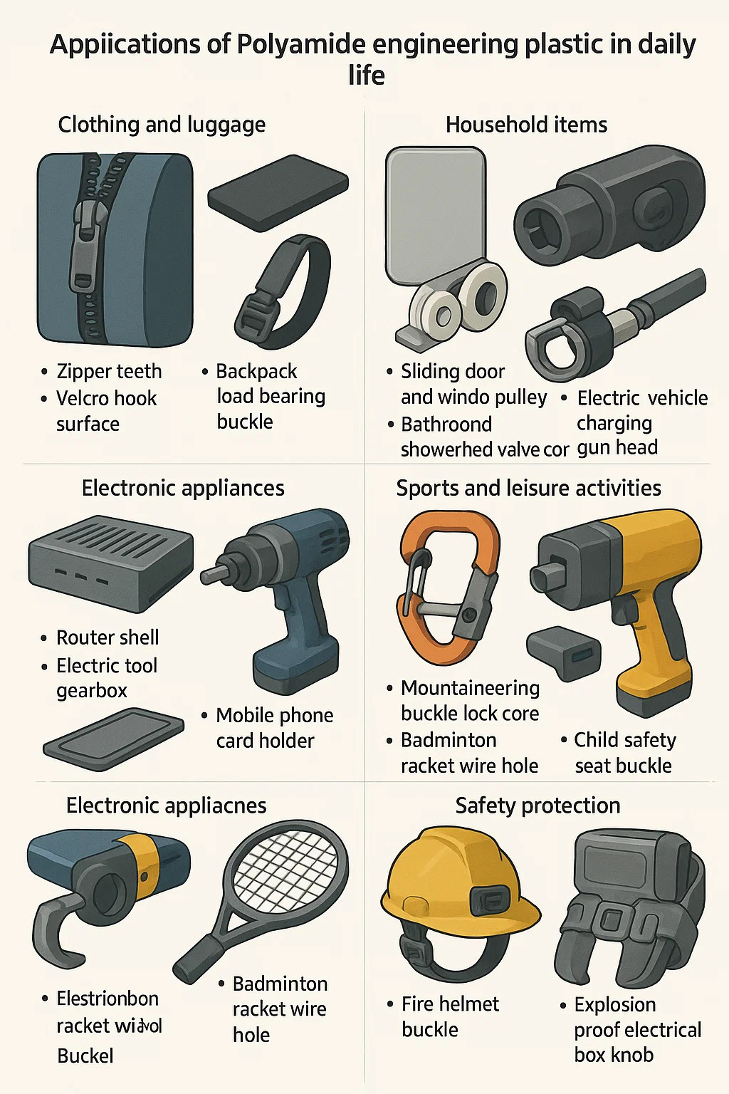 Penerapan rekayasa poliamida plastik Dalam kehidupan sehari -hari meresapi beberapa bidang, dan nilai intinya terletak pada karakteristik mengganti baja dengan plastik dan menjadi ringan dan tahan lama. Skenario khas khusus adalah sebagai berikut: