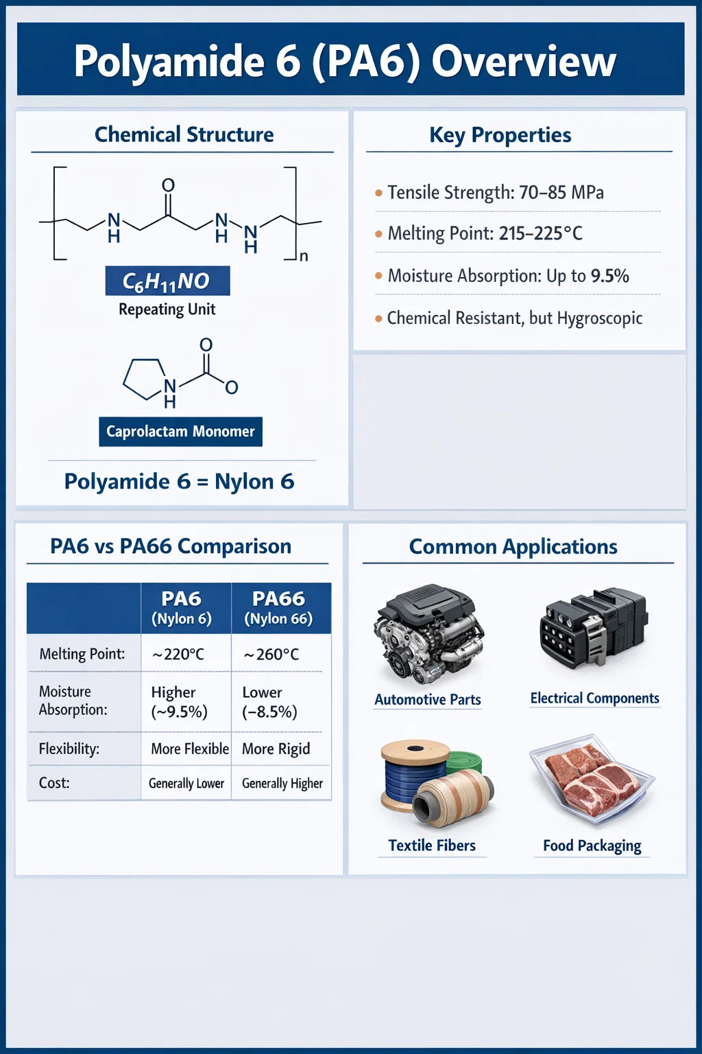 Profil kinerja Poliamida 6 menjadikannya salah satu termoplastik rekayasa paling serbaguna yang tersedia. Tabel berikut merangkum sifat-sifat khas PA6 kelas standar yang tidak terisi dalam kondisi cetakan kering (DAM):
