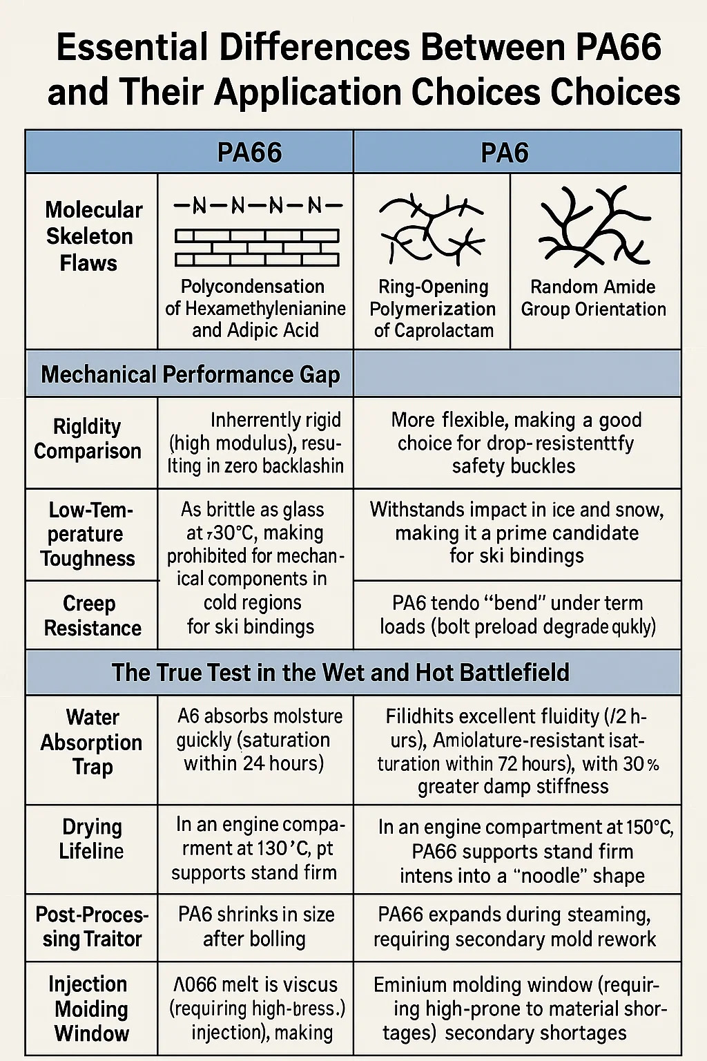 Pengkhianat pasca-pemrosesan: PA6 menyusut dalam ukuran setelah mendidih (pelepasan stres internal); PA66 memperluas selama mengukus, membutuhkan pengerjaan ulang cetakan sekunder. V. Bidang seleksi kehidupan-atau-mati